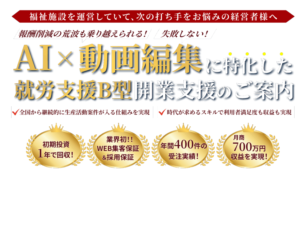 弊社からのお仕事のご提供や、高単価案件を受注できる制作体制の構築方法、うつや発達障害の方々を募集して安定通所まで引き上げ、クリエイターとして育成する訓練カリキュラムなどをご提供できます。